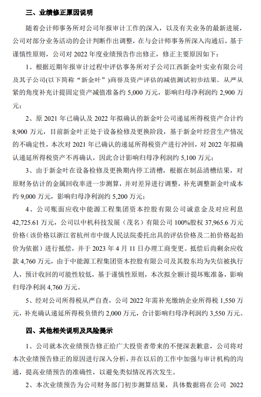 金圓股份還提到公司賬面應(yīng)收中能源工程集團(tuán)資本控股有限公司誠意金及對(duì)應(yīng)利息42725.61萬元,公司以中機(jī)科技發(fā)展(茂名)有限公司100%股權(quán)37965.6萬元價(jià)格進(jìn)行抵償,并于2023年4月11日辦理工商變更。抵償后尚剩余應(yīng)收款4760萬元,由于中能源工程集團(tuán)資本控股有限公司及其股東均為失信被執(zhí)行人,預(yù)計(jì)收回的可能性較低,基于謹(jǐn)慎性原則,本次擬全額計(jì)提壞賬準(zhǔn)備,影響歸母凈利潤4760萬元。