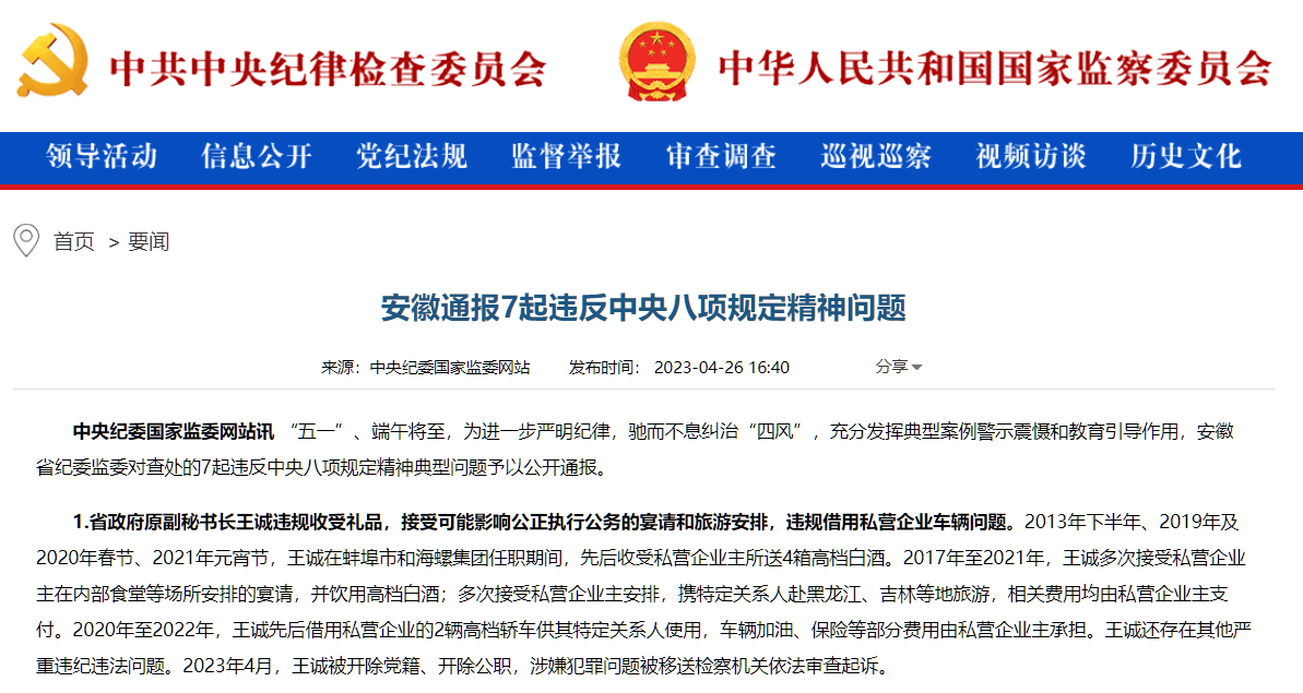 在通過近一年的調(diào)查之后,王誠違紀違法問題被公布于眾,根據(jù)安徽省紀委監(jiān)委通報了7起違反中央八項規(guī)定精神問題稱,2013年下半年、2019年及2020年春節(jié)、2021年元宵節(jié),王誠在蚌埠市和海螺集團任職期間,先后收受私營企業(yè)主所送4箱高檔白酒。