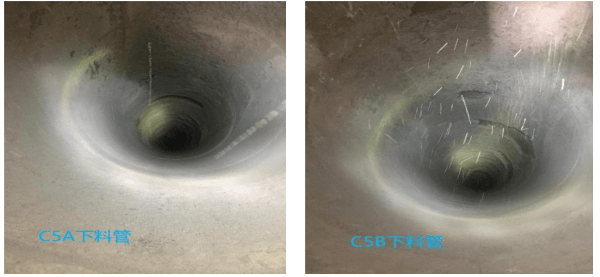 結(jié)合水泥廠工藝實(shí)際情況,經(jīng)報(bào)集團(tuán)技術(shù)服務(wù)部批準(zhǔn),該水泥廠最終決定采用耐火科技生產(chǎn)研發(fā)的“新型氮化硅微晶下料管”。經(jīng)過為期一年的使用后,雙方對(duì)微晶下料管進(jìn)行檢查,結(jié)果發(fā)現(xiàn)下料管壁內(nèi)完好、整體未見明顯結(jié)皮,C5A 下料管錐部轉(zhuǎn)彎處有少許懸掛料,但不大于 1cm,整體效果比較完好,并且未發(fā)生因 C5 下料管結(jié)皮堵塞導(dǎo)致的停窯事故,保證了窯系統(tǒng)的安全運(yùn)行,檢查結(jié)果如下圖。