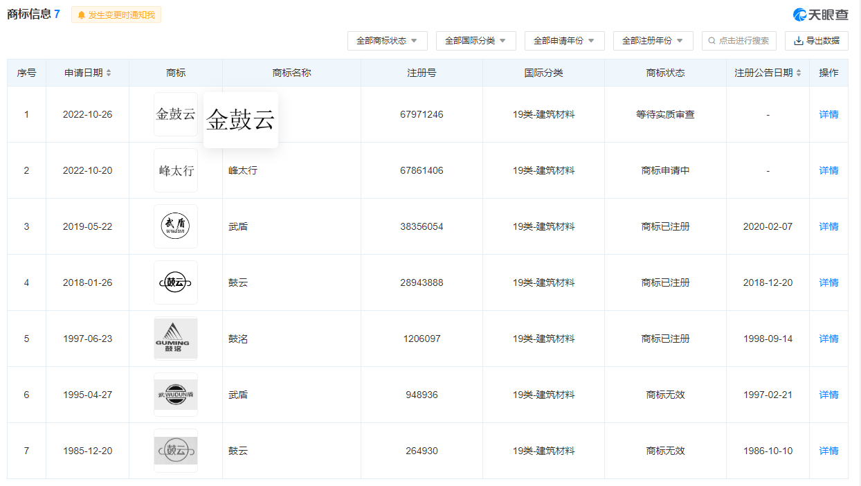 該企業(yè)名下共有7條商標(biāo)信息,其中圖形武盾、鼓云、鼓洺3個(gè)商標(biāo)為已注冊狀態(tài),2022年10月申請的金鼓云商標(biāo)目前狀態(tài)為“等待實(shí)質(zhì)審查”;同期申請的“峰太行”狀態(tài)為“商標(biāo)申請中”;1995年4月27日申請的圖形“武盾”和1985年申請的圖片“鼓云”目前為無效狀態(tài)。上圖中標(biāo)注為“20220921出廠”的產(chǎn)品商標(biāo)正是1995年4月27日申請的目前為無效狀態(tài)的圖形“武盾”。