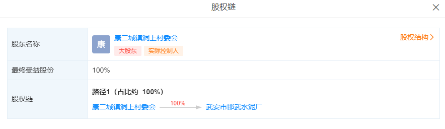 據(jù)查詢,武安市邯武水泥廠法定代表人王騰,工商注冊地址為河北省邯鄲市武安市康二城鎮(zhèn)洞上村東。股權(quán)鏈信息顯示,其大股東為康二城鎮(zhèn)洞上村委會(huì)。