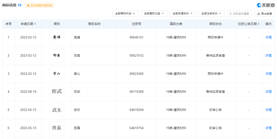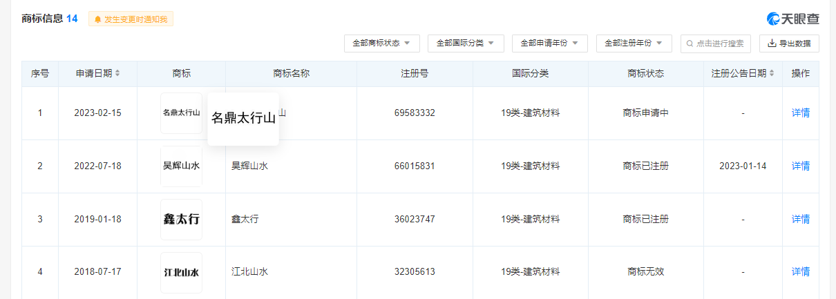 旗下共有14條商標(biāo)信息,其中2023年2月15日申請的“名鼎太行山”商標(biāo)目前狀態(tài)為“商標(biāo)申請”。“金隅太行山”未查到。