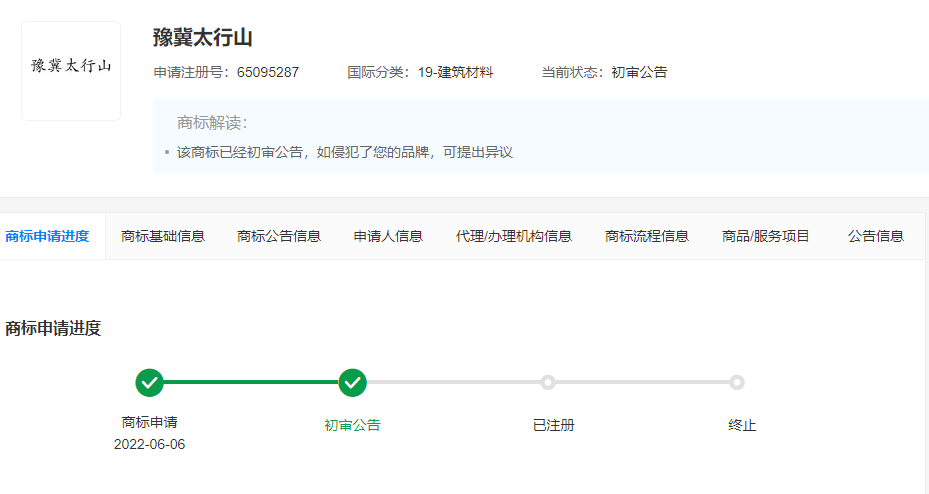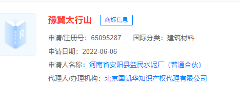 據(jù)市場反饋,來自河南安陽區(qū)域的兩個(gè)品牌在邯鄲武安流通市場也有出現(xiàn)。“豫冀太行山”品牌,申請人為河南省安陽縣益民水泥廠,目前狀態(tài)為初審公告階段。