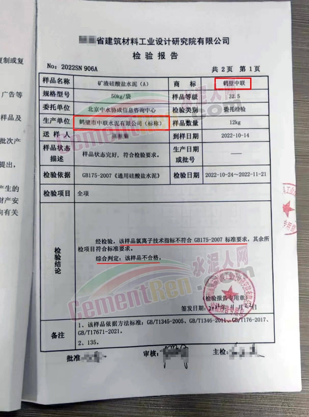 據(jù)水泥質(zhì)量萬里行組委會(huì)反饋,在抽檢的不合格水泥中,包括標(biāo)稱生產(chǎn)單位為鶴壁市中聯(lián)水泥有限公司(以下簡稱“鶴壁市中聯(lián)水泥”該企業(yè)非中國建材集團(tuán)旗下企業(yè))旗下的“眾力山水”和標(biāo)稱為“鶴壁中聯(lián)”牌的兩個(gè)批次P.S.A32.5礦渣硅酸鹽水泥樣品委托檢驗(yàn)報(bào)告檢驗(yàn)結(jié)論均為“氯離子技術(shù)指標(biāo)不符合GB175-2007標(biāo)準(zhǔn)要求,綜合判定為該樣品不合格”。