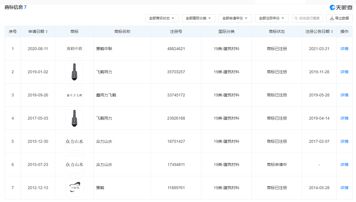 企業(yè)共有7條商標(biāo)信息,豫鶴中聯(lián)、飛鶴同力、鑫同力飛鶴、眾力山水、豫鶴等6個(gè)商標(biāo)分別在2014年5月28日到2021年3月21日期間注冊完成。