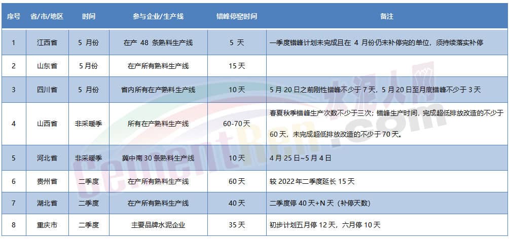 湖南省水泥協(xié)會(huì)《關(guān)于2023年二季度增加5天錯(cuò)峰停窯的通知》要求一、二季度在原有35天基礎(chǔ)上增加5天錯(cuò)峰停窯時(shí)間,其中一季度未停窯到位的單位在二季度補(bǔ)停到位,即二季度停40天+N天(補(bǔ)停天數(shù))。