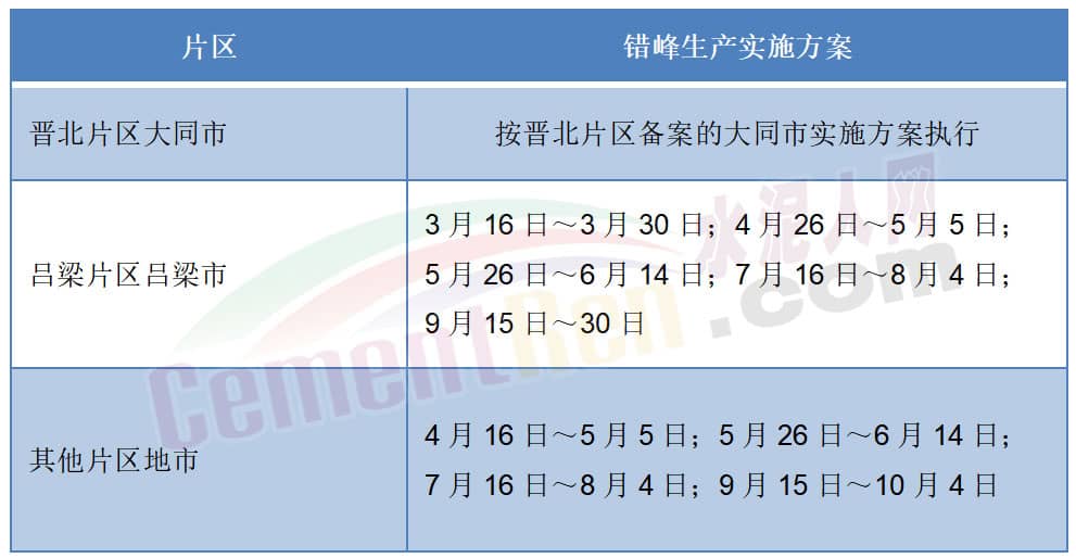 《山西省水泥行業(yè)2023-2024年錯(cuò)峰生產(chǎn)工作實(shí)施方案》要求所有水泥熟料生產(chǎn)線非采暖錯(cuò)峰生產(chǎn)次數(shù)不少于三次;其中完成超低排放改造的企業(yè)不少于60天,未完成超低排放改造的企業(yè)不少于70天。
