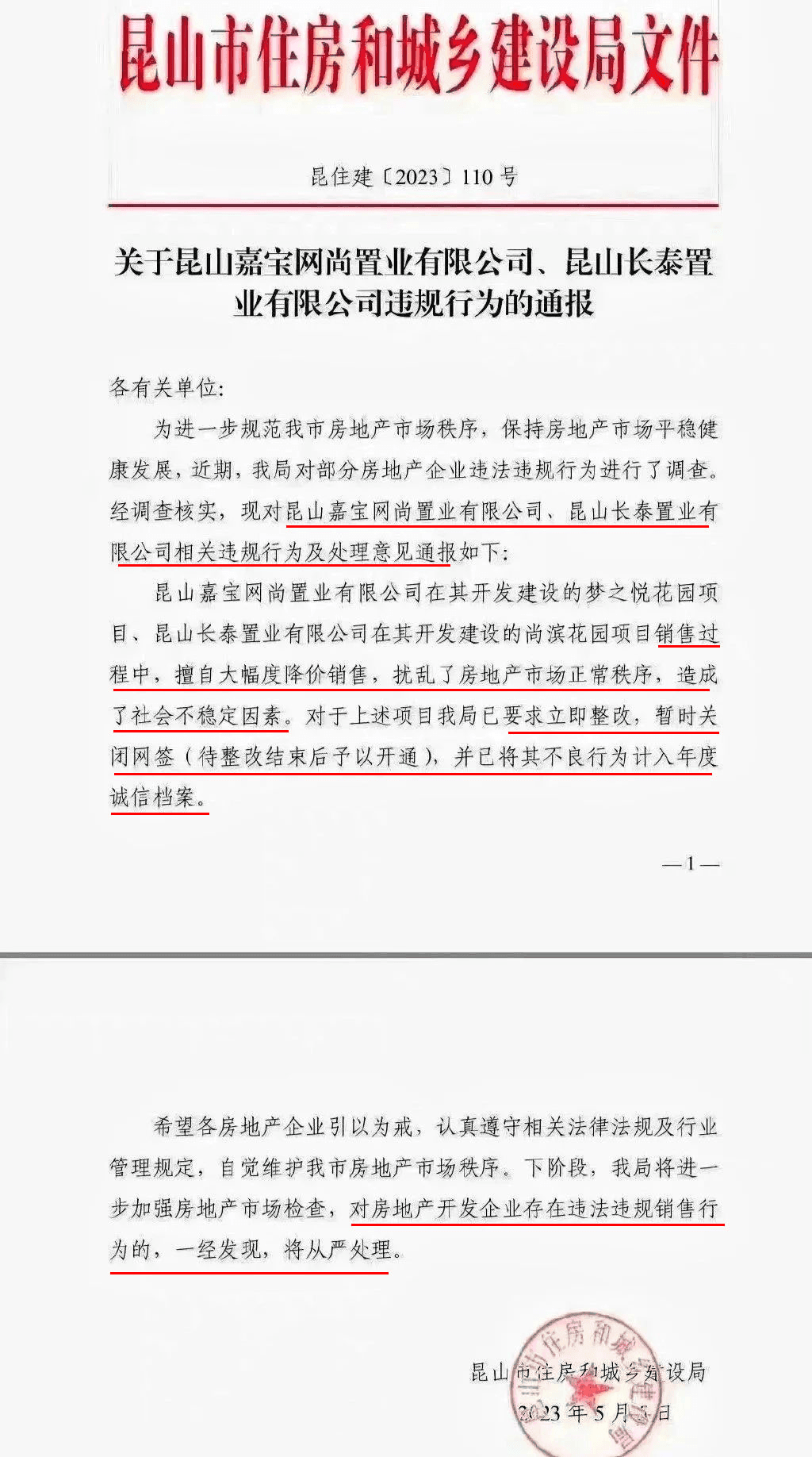 日前,江蘇蘇州昆山住建局在微信群發(fā)布一則通報文件,兩家房企因在售房過程中,擅自大幅度降價銷售,擾亂了房地產(chǎn)市場正常秩序被處罰。