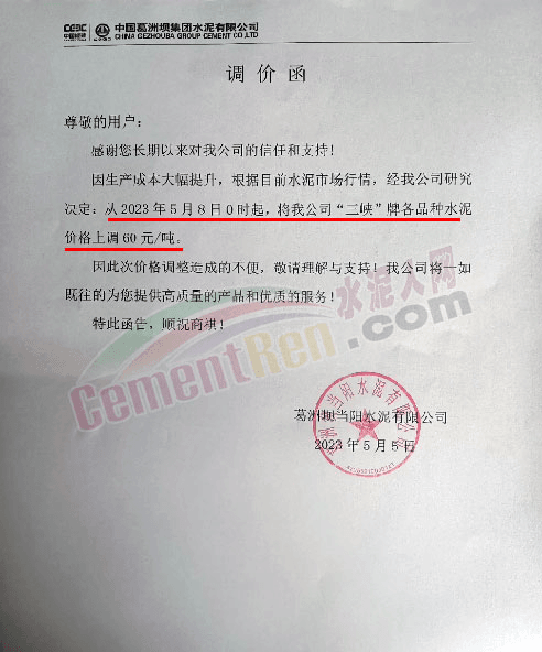 據(jù)了解,自年初以來水泥市場波動頻繁,部分區(qū)域水泥價格已然觸底。5月5日葛洲壩當陽水泥有限公司通知稱,因生產(chǎn)成本大幅提升,根據(jù)目前水泥市場行情,經(jīng)公司研究決定從2023年5月8日0時起,將公司“三峽”牌各品種水泥價格上調(diào)60元/噸。