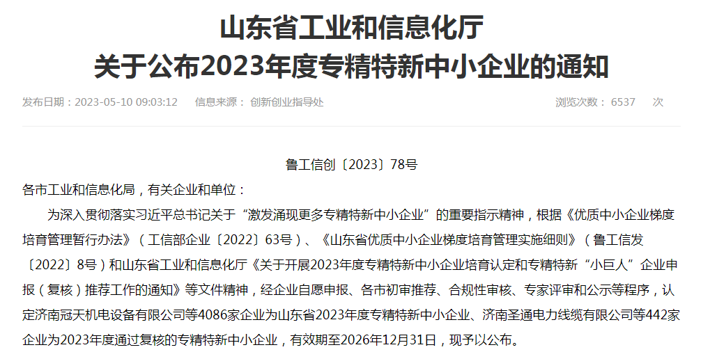 5月10日,山東省工業(yè)和信息化廳發(fā)布“2023年度專精特新中小企業(yè)”通知名單,山東永正產(chǎn)業(yè)技術(shù)研究院憑借自身實(shí)力和專業(yè)技術(shù),通過層層專業(yè)評(píng)審榮登榜單。