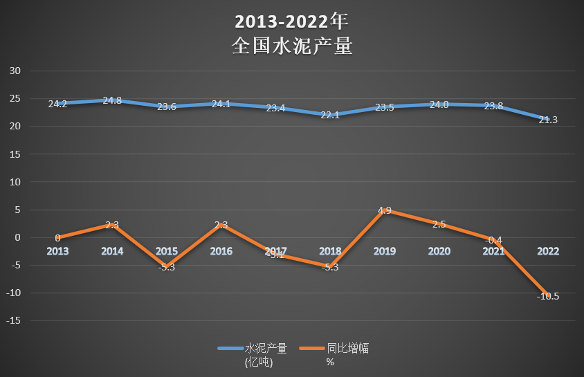 從近幾年國家統(tǒng)計(jì)局發(fā)布的數(shù)據(jù)來看, 全國水泥產(chǎn)量在2014年達(dá)到高位后開始回落。2022年全國水泥產(chǎn)量21.3億噸,同比下降10.5%,創(chuàng)下近十年來的最大跌幅。