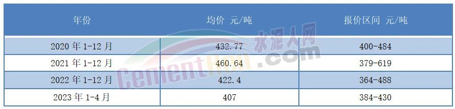 從水泥價(jià)格方面來看,2023年在煤炭價(jià)格大幅上漲的背景下,2023年1-4月流通領(lǐng)域P.O42.5散裝水泥均價(jià)為407元/噸,各時(shí)間段報(bào)價(jià)在384-430元/噸之間波動(dòng),且多個(gè)時(shí)間段水泥價(jià)格在400元/噸以下。