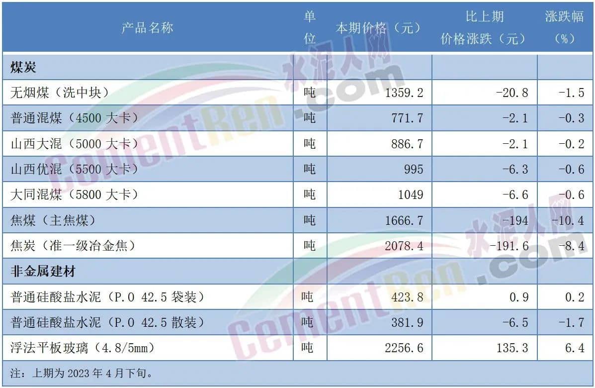 國家統(tǒng)計局最新發(fā)布的全國流通領(lǐng)域9大類50種重要生產(chǎn)資料市場價格顯示,2023年5月上旬與4月下旬相比,8種產(chǎn)品價格上漲,42種下降。其中,普通硅酸鹽水泥(P.O 42.5散裝)價格為381.9元/噸,較4月下旬下跌6.5元/噸,跌幅1.7%,為今年初至今的最低點了。