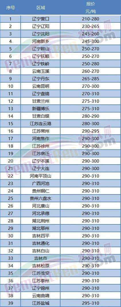 吉林四平、通化、白山、松原,湖北荊州、鄂州,河北唐山、承德,貴州省內(nèi)銅仁、六盤水,廣西河池等區(qū)域報價在290-310元/噸。