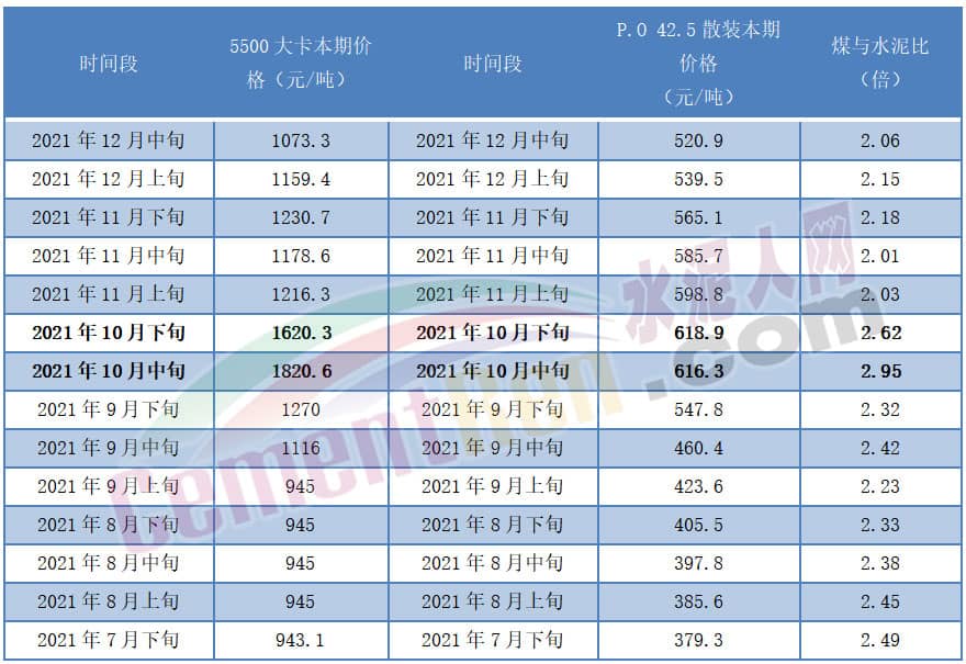國家統(tǒng)計局公布的數(shù)據(jù)顯示,2021年10月中下旬5500大卡煤炭報價1600元/噸以上的時候,水泥價格也漲至當年最高點610元/噸以上。且自7月下旬到12月中旬,煤價一直是水泥價格的兩倍多。