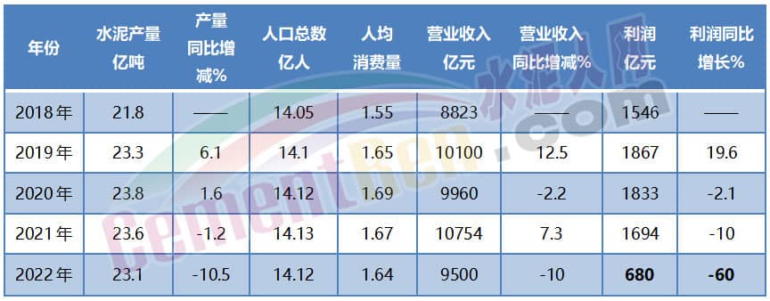 從國家統(tǒng)計局近年來公布的建材行業(yè)經(jīng)濟運行情況來看,水泥產(chǎn)量一直處于平臺期,人均消費量在1.5~1.7噸之間,2018~2021年利潤也多在1000億元左右,而2022年卻直降60%至680億。從數(shù)字上來看,需求并沒有大幅減少,但利潤直線下跌。