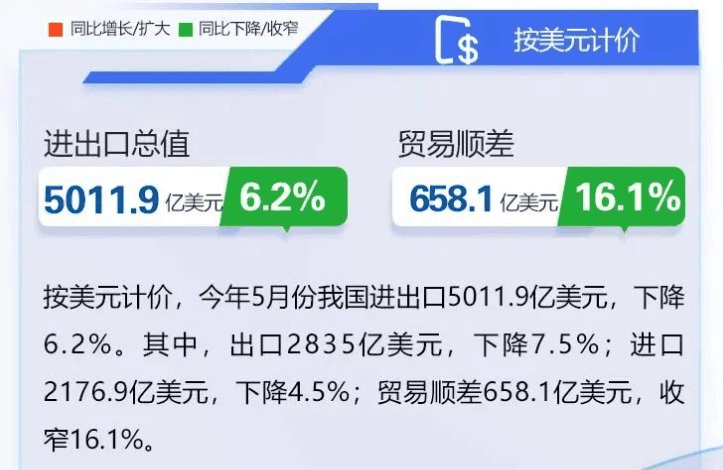 事實(shí)上,光伏行業(yè)的出口受到壓制只是近期國(guó)內(nèi)外貿(mào)行業(yè)的一個(gè)縮影,多方的制裁和約束,也讓國(guó)內(nèi)的外貿(mào)企業(yè)走入更深的困境。據(jù)海關(guān)統(tǒng)計(jì),今年5月份,我國(guó)進(jìn)出口3.45萬億元,增長(zhǎng)0.5%。其中,出口1.95萬億元,下降0.8%;按美元計(jì)價(jià),今年5月份我國(guó)進(jìn)出口5011.9億美元,下降6.2%。其中,出口2835億美元,下降7.5%。貿(mào)易順差658.1億美元,收窄16.1%。