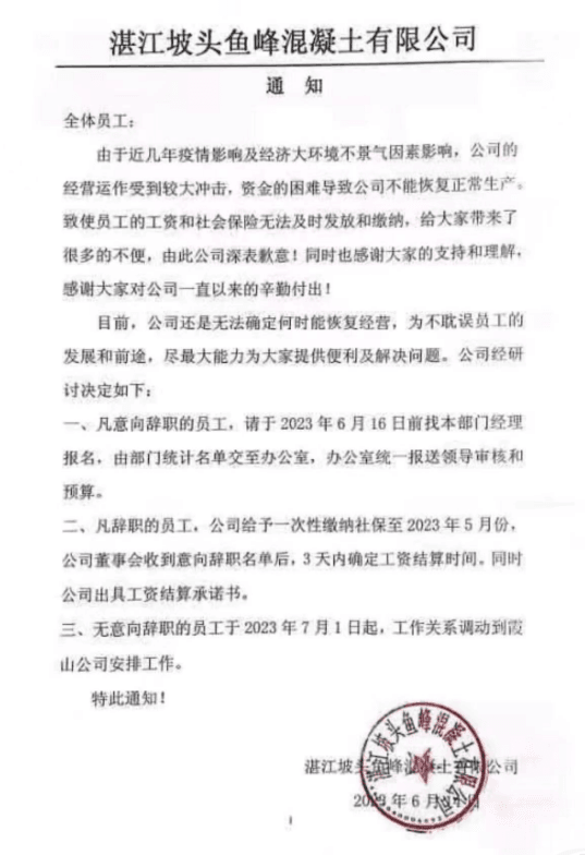 日前,廣東湛江坡頭魚峰混凝土有限公司發(fā)通知給員工稱,由于近幾年疫情影響及經(jīng)濟(jì)大環(huán)境不景氣因素影響,公司的經(jīng)營運(yùn)作受到較大沖擊,資金的困難導(dǎo)致公司不能恢復(fù)正常生產(chǎn),致使員工的工資和社會(huì)保險(xiǎn)無法及時(shí)發(fā)放和繳納。目前,公司無法確定何時(shí)能恢復(fù)經(jīng)營,為不耽誤員工的發(fā)展和前途,為員工提供了離職與調(diào)動(dòng)方案。