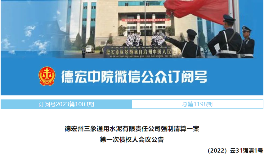 6月19日,德宏中院發(fā)布《德宏州三象通用水泥有限責(zé)任公司強(qiáng)制清算一案第一次債權(quán)人會(huì)議公告》稱,定于2023年6月28日上午9時(shí)30分以網(wǎng)絡(luò)會(huì)議形式召開德宏州三象通用水泥有限責(zé)任公司第一次債權(quán)人會(huì)議。