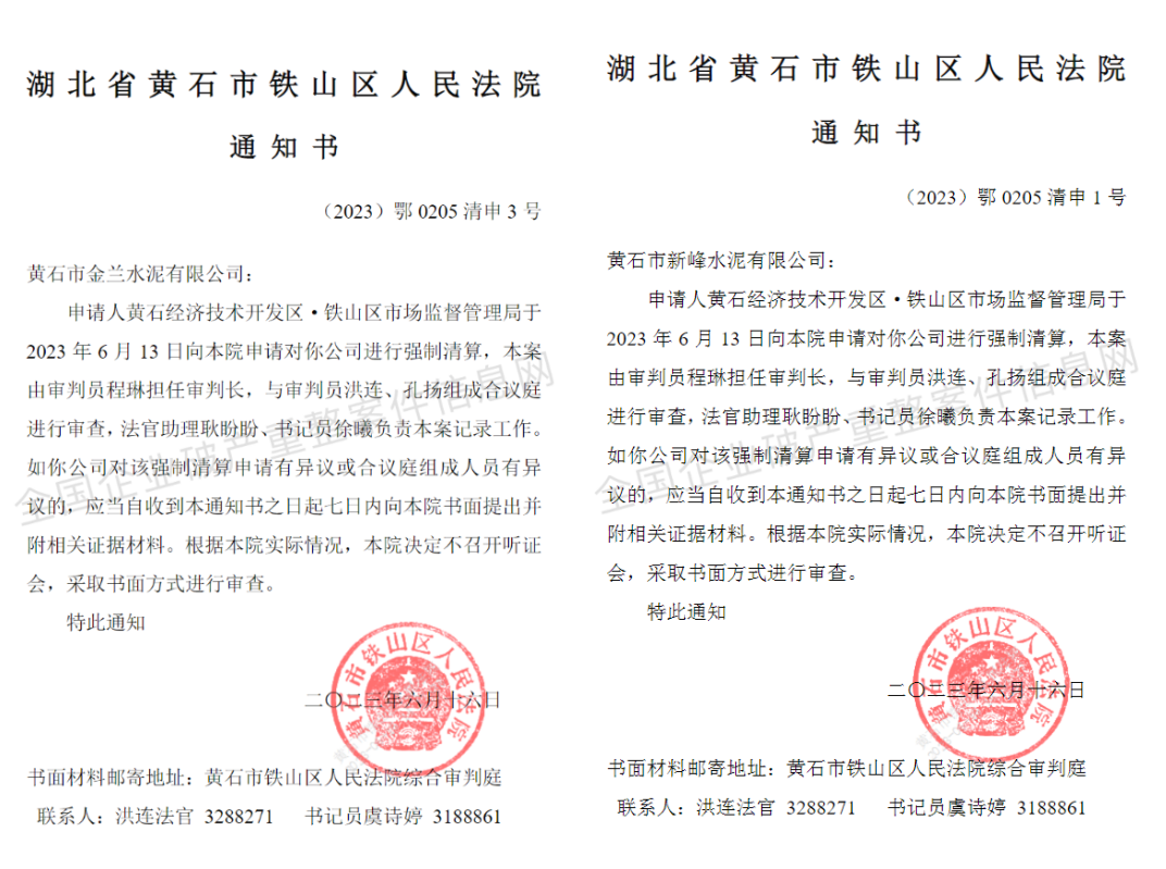 據(jù)全國企業(yè)破產(chǎn)重整案件信息網(wǎng)消息,近日,湖北黃石經(jīng)濟(jì)技術(shù)開發(fā)區(qū)·鐵山區(qū)市場監(jiān)督管理局于2023年6月13日向法院申請對黃石市金蘭水泥有限公司、黃石市新峰水泥有限公司兩家企業(yè)進(jìn)行強(qiáng)制清算。