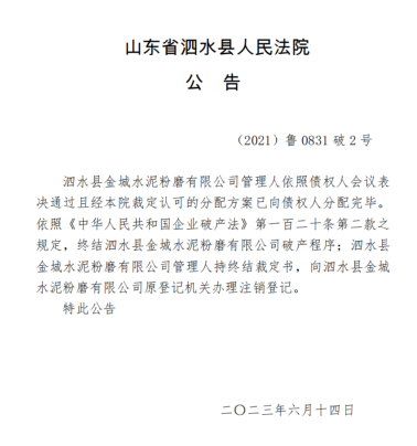 6月14日山東省泗水縣人民法院發(fā)布公告稱,泗水縣金城水泥粉磨有限公司管理人依照債權(quán)人會(huì)議表決通過且經(jīng)本院裁定認(rèn)可的分配方案已向債權(quán)人分配完畢。依照《中華人民共和國企業(yè)破產(chǎn)法》相關(guān)規(guī)定,終結(jié)泗水縣金城水泥粉磨有限公司破產(chǎn)程序;泗水縣金城水泥粉磨有限公司管理人持終結(jié)裁定書,向泗水縣金城水泥粉磨有限公司原登記機(jī)關(guān)辦理注銷登記。