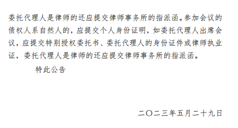 參加會(huì)議的債權(quán)人是法人或其他組織的,應(yīng)當(dāng)提供營業(yè)執(zhí)照、法定代表人或負(fù)責(zé)人身份證明書,如委托代理人參加的,還應(yīng)當(dāng)提供特別授權(quán)委托書、委托人身份證或律師執(zhí)業(yè)證,委托代理人是律師的還應(yīng)提交律師事務(wù)所的指派函,并于2023年6月28日上午9點(diǎn)20分登錄破易云平臺(tái)(方式一:手機(jī)微信搜索“破易云”小程序,在登錄頁中輸入手機(jī)號(hào)、獲取短信驗(yàn)證碼并輸入案件識(shí)別碼:111481,登錄參會(huì);方式二:電腦瀏覽器訪問網(wǎng)址https://zqr.poyiyun.com/ 登錄后參與會(huì)議,本案件識(shí)別碼:111481)召開德宏州三象通用水泥有限責(zé)任公司強(qiáng)制清算案第一次債權(quán)人正式會(huì)議,本次會(huì)議開始前管理人將會(huì)議文本上傳至破易云平臺(tái),請債權(quán)人及時(shí)登陸破易云平臺(tái)下載查閱。請各位債權(quán)人準(zhǔn)時(shí)登錄系統(tǒng),點(diǎn)擊進(jìn)入債權(quán)人會(huì)議,通過網(wǎng)絡(luò)方式參與會(huì)議和投票表決。