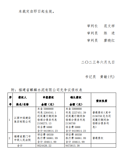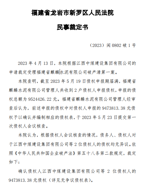 2023年4月13日,福建省龍巖市新羅區(qū)人民法院根據(jù)江西中煤建設(shè)集團(tuán)有限公司的申請裁定受理福建省麒麟水泥有限公司破產(chǎn)清算一案。法院查明,截至2023年5月19日債權(quán)申報(bào)期屆滿,福建省麒麟水泥有限公司管理人共收到2戶債權(quán)人申報(bào)債權(quán),申報(bào)的債權(quán)總額為9524426.22元。