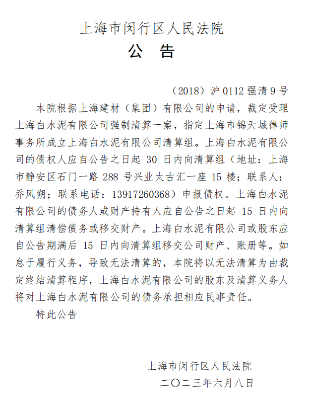 上海市閔行區(qū)人民法院公告,根據(jù)上海建材(集團(tuán))有限公司的申請,裁定受理上海白水泥有限公司強(qiáng)制清算一案,指定上海市錦天城律師事務(wù)所成立上海白水泥有限公司清算組。