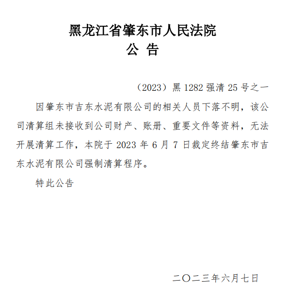 因肇東市吉東水泥有限公司的相關(guān)人員下落不明,清算組未接收到公司財(cái)產(chǎn)、賬冊、重要文件等資料,無法開展清算工作,黑龍江省肇東市人民法院于2023年6月7日裁定終結(jié)肇東市吉東水泥有限公司強(qiáng)制清算程序。