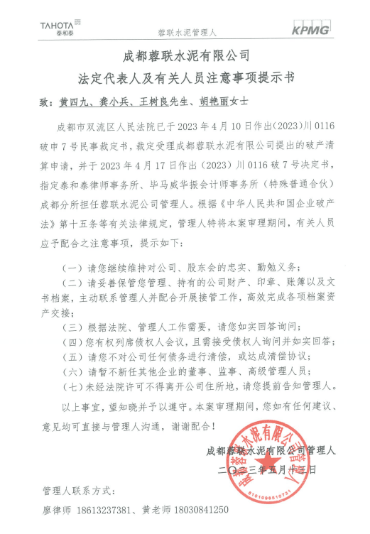 成都市雙流區(qū)人民法院于2023年4月10日裁定受理成都蓉聯(lián)水泥有限公司提出的破產(chǎn)清算申請,并于2023年4月17日指定泰和泰律師事務(wù)所、畢馬威華振會(huì)計(jì)師事務(wù)所特殊普通合伙成都分所擔(dān)任蓉聯(lián)水泥公司管理人。