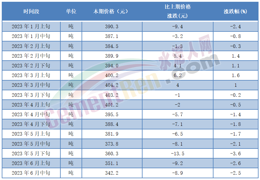 廣西區(qū)域某品牌企業(yè)銷(xiāo)售負(fù)責(zé)人表示:淡季市場(chǎng)“全國(guó)統(tǒng)一”行情。從國(guó)家統(tǒng)計(jì)局近日發(fā)布的2023年6月中旬流通領(lǐng)域水泥市場(chǎng)價(jià)格變動(dòng)情況可見(jiàn),雖煤炭?jī)r(jià)格出現(xiàn)小幅回升,但水泥價(jià)格仍持續(xù)下跌,P.O42.5散裝水泥較6月上旬下跌8.9元/噸,又一次刷新近五年來(lái)的價(jià)格最低點(diǎn)。