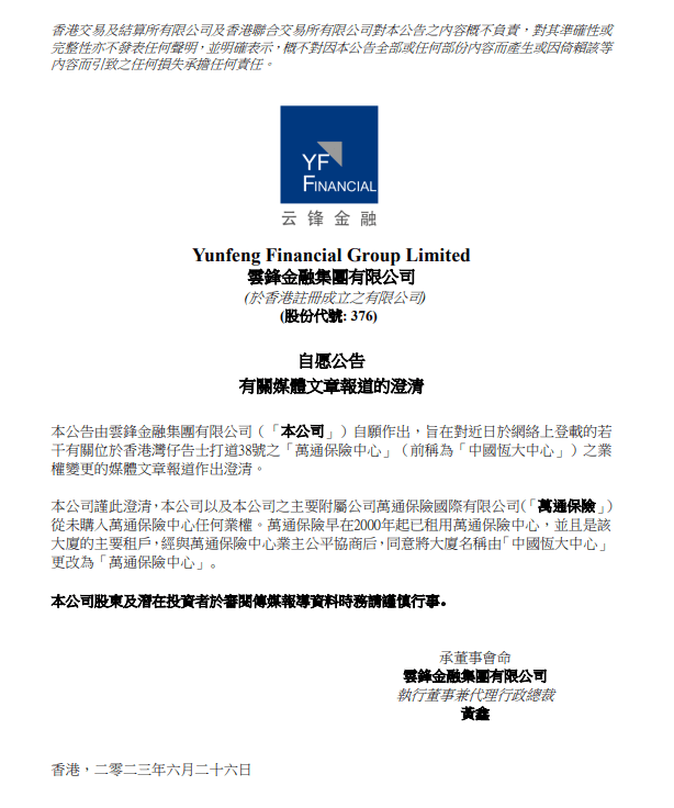 至此,外界猜測相關業(yè)權也作出變更。6月26日,云鋒金融集團對此傳聞作出澄清。公告稱,公司及公司之非全資附屬公司萬通保險國際有限公司從未購入萬通保險中心(原中國恒大中心)任何業(yè)權。