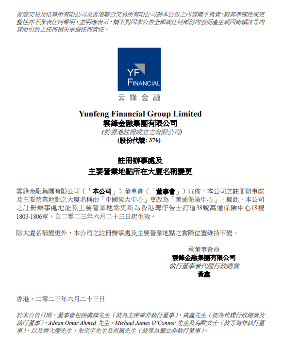 6月23日,云鋒金融集團發(fā)布公告,公司之注冊辦事處及主要營業(yè)地點之大廈名稱由“中國恒大中心”更改為“萬通保險中心”。據此,公司之注冊辦事處地址及主要營業(yè)地點更新為香港灣仔告士打道38號萬通保險中心18樓1803-1806室,自2023年6月23日起生效。