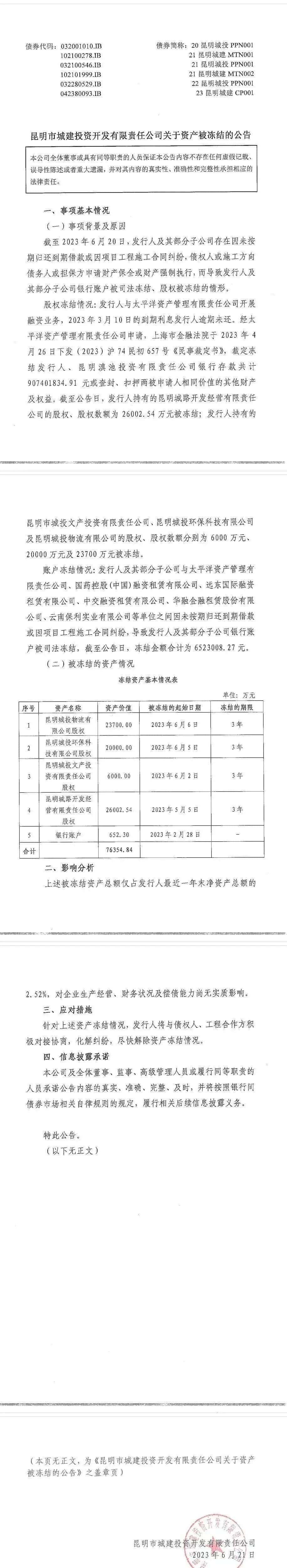 6月21日,昆明市城建投資開發(fā)有限責任公司發(fā)布公告,截至2023年6月20日,發(fā)行人及其部分子公司存在因未按期歸還到期借款或因項目工程施工合同糾紛,債權人或施工方向債務人或擔保方申請財產保全或財產強制執(zhí)行,而導致發(fā)行人及其部分子公司銀行賬戶被司法凍結、股權被凍結合計7.64億。