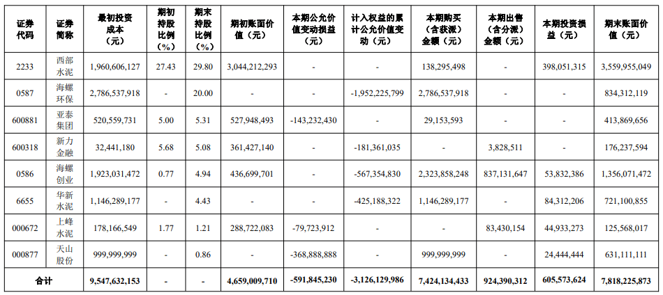 報告顯示,海螺水泥持有的新力金融、海螺創(chuàng)業(yè)、華新水泥計入“其他權(quán)益工具投資”科目,海螺環(huán)保、西部水泥計入“長期股權(quán)投資”科目,亞泰集團(tuán)、上峰水泥、天山股份計入“交易性金融資產(chǎn)”科目。