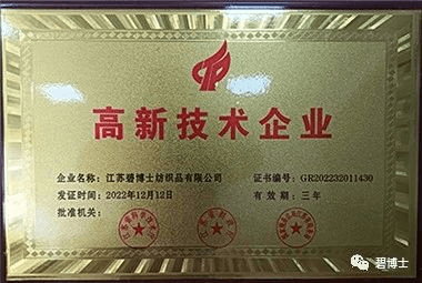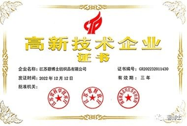 近日,江蘇碧博士紡織品有限公司(以下簡稱“碧博士”)成功獲得國家“高新技術(shù)企業(yè)”認定殊榮,正式邁入國家高新技術(shù)企業(yè)行列。本次成功入選高新技術(shù)企業(yè),是國家相關(guān)部門對碧博士多年來工作的肯定,也是碧博士產(chǎn)品研發(fā)實力與創(chuàng)新能力的體現(xiàn)。