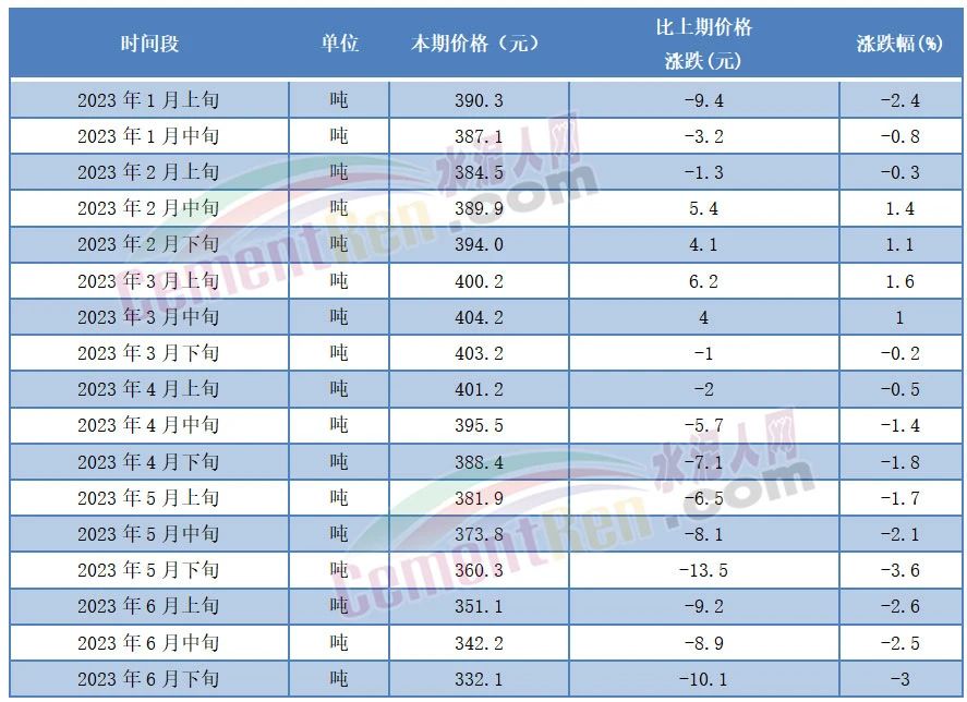7月4日,國家統(tǒng)計局發(fā)布2023年6月下旬流通領(lǐng)域重要生產(chǎn)資料市場價格變動情況,其中P.O42.5散裝水泥報價332.1元/噸,環(huán)比6月中旬下跌10.1元/噸,跌幅3%。
