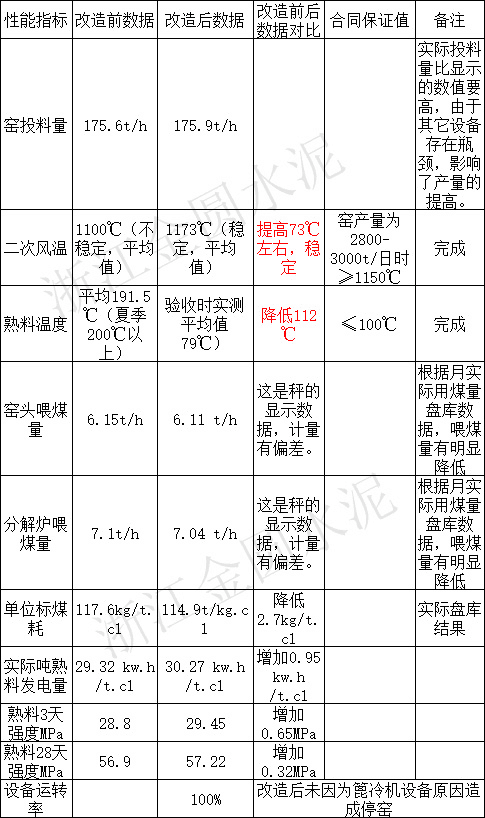 改造施工工程歷時(shí)30 天,經(jīng)過(guò)一段時(shí)間的運(yùn)行及調(diào)試消缺,該設(shè)備運(yùn)轉(zhuǎn)正常,各工藝參數(shù)穩(wěn)定,目前窯產(chǎn)量能連續(xù)穩(wěn)定達(dá)到2800-3000T/D(因其它因素的影響,提產(chǎn)方面尚有瓶頸),取得的節(jié)能指標(biāo)十分明顯。經(jīng)金圓水泥設(shè)備部、生產(chǎn)部、安環(huán)部等大半年的運(yùn)行評(píng)審與考核,所有改造的預(yù)期目標(biāo)全部達(dá)到,實(shí)際運(yùn)行指標(biāo)均超過(guò)合同考核標(biāo)準(zhǔn)。