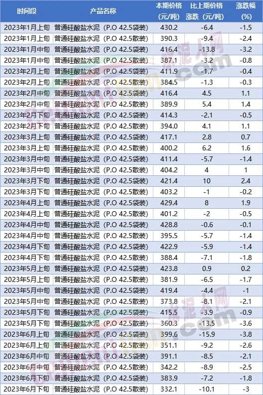 從國家統(tǒng)計局近期發(fā)布的6月下旬流通領(lǐng)域水泥報價可見,P.O42.5散裝水泥報價報價332.1元/噸,較1月上旬報價390.3元/噸下跌58.2元/噸,跌幅17.52%。