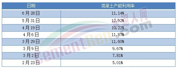 水泥銷量及庫存壓力從各區(qū)域商混攪拌站產(chǎn)能利用率可見一斑。從2月中旬至6月下旬調(diào)研數(shù)據(jù)可見,混凝土產(chǎn)能利用率均值從5%左右升至4月中旬13.22%又轉(zhuǎn)向下滑。