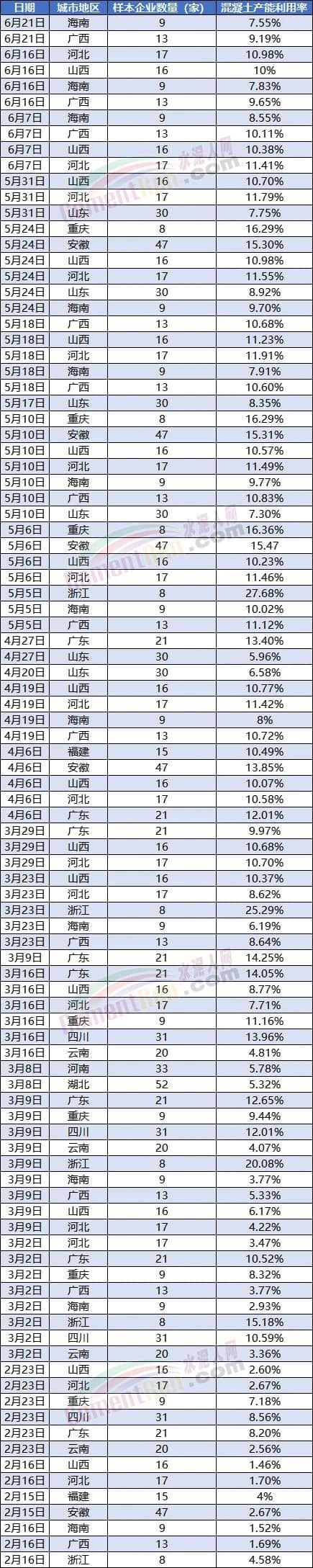 相比較而言,浙江區(qū)域混凝土產(chǎn)能利用率相對較高,卻也只在15.18%~27.68%之間。絕大多數(shù)地區(qū)混凝土產(chǎn)能利用率僅在10%左右。