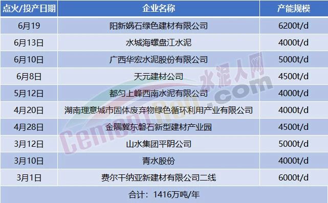 據(jù)水泥人網(wǎng)不完全統(tǒng)計,2023年上半年包括陽新媧石綠色建材二期6200t/d水泥熟料生產(chǎn)線在內(nèi)的10條生產(chǎn)線集中點火,釋放產(chǎn)能達1416萬噸/年。