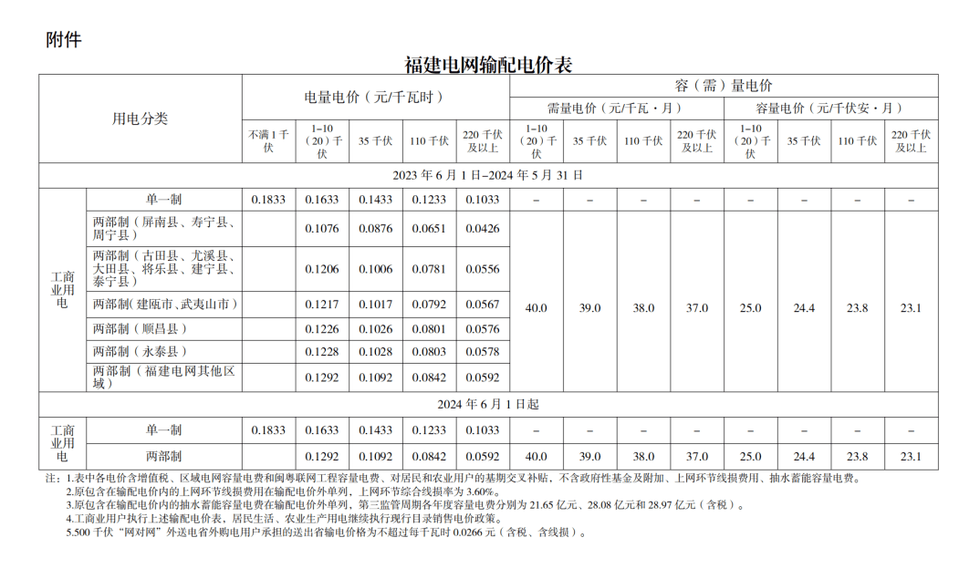福建省發(fā)展和改革委員會(huì)發(fā)布《關(guān)于落實(shí)第三監(jiān)管周期輸配電價(jià)有關(guān)事項(xiàng)的通知》 。新的省級(jí)電網(wǎng)輸配電價(jià)自2023年6月1日起執(zhí)行,即全省工商業(yè)用戶6月份用電產(chǎn)生電費(fèi)按最新電價(jià)政策執(zhí)行。此次電價(jià)調(diào)整對(duì)象為全省工商業(yè)用戶,除執(zhí)行居民生活和農(nóng)業(yè)生產(chǎn)用電價(jià)格以外的用電。