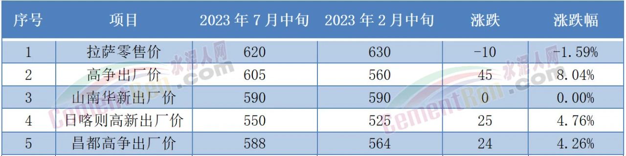 對比今年2月中旬報價除零售價格略有下跌,山南華新出廠價持平外,其他企業(yè)出廠價均有不同幅度上漲。