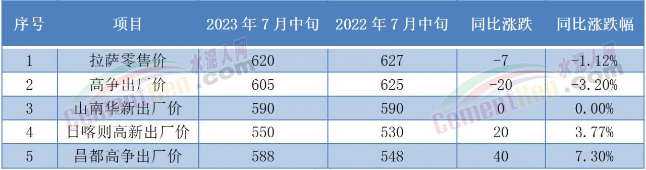 據西藏發(fā)改委近期數(shù)據:2023年7月12日監(jiān)測的22種拉薩市主要建材市場價格數(shù)據顯示,水泥出廠價格與2022年同比,拉薩高爭42.5水泥下降3.20%;高新42.5水泥上漲2.64%、昌都高爭42.5水泥上漲6.39%;華新42.5水泥價格持平。水泥零售價格與2022年同比,拉薩水泥42.5(強度)零售價格下降1.12%。