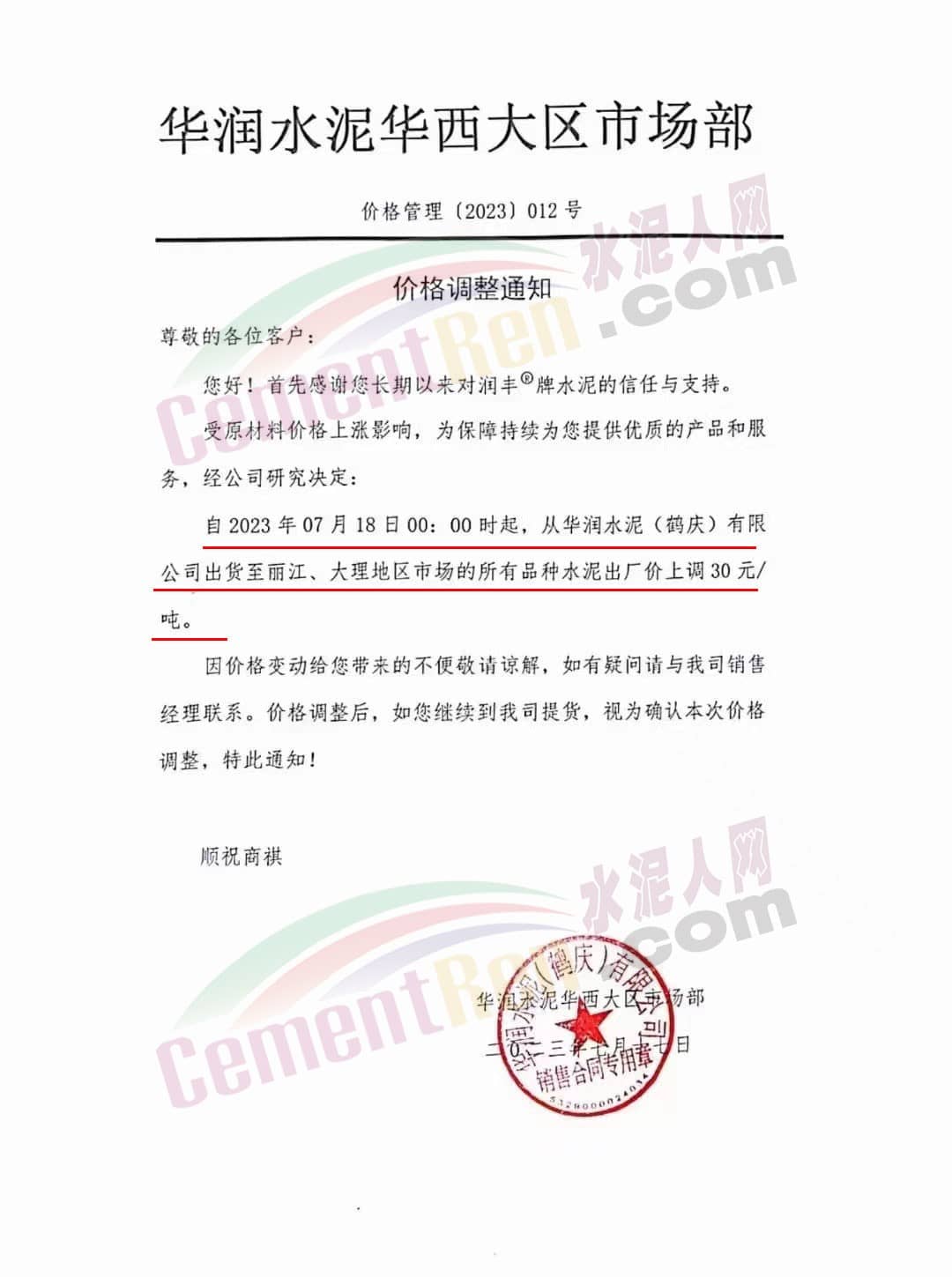 華潤(rùn)水泥華西大區(qū)市場(chǎng)部通知受原材料價(jià)格上漲影響,為保障持續(xù)為客戶提供優(yōu)質(zhì)的產(chǎn)品和服務(wù),經(jīng)公司研究決定,自2023年7月18日0時(shí)起,從華潤(rùn)水泥(鶴慶)有限公司出貨至麗江、大理地區(qū)市場(chǎng)的所有品種水泥出廠價(jià)上調(diào)30元/噸。