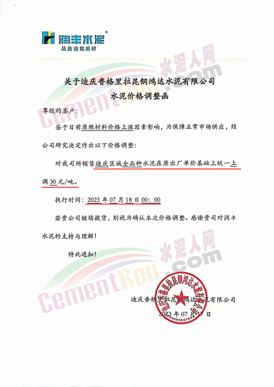 迪慶香格里拉昆鋼鴻達(dá)水泥有限公司通知鑒于目前原燃材料價(jià)格上漲因素影響,為保障正常市場(chǎng)供應(yīng),經(jīng)公司研究決定作出以下價(jià)格調(diào)整,對(duì)銷售迪慶區(qū)域全品種水泥在原出廠單價(jià)基礎(chǔ)上統(tǒng)一上調(diào)30元/噸,執(zhí)行時(shí)間2023年7月18日0時(shí)。