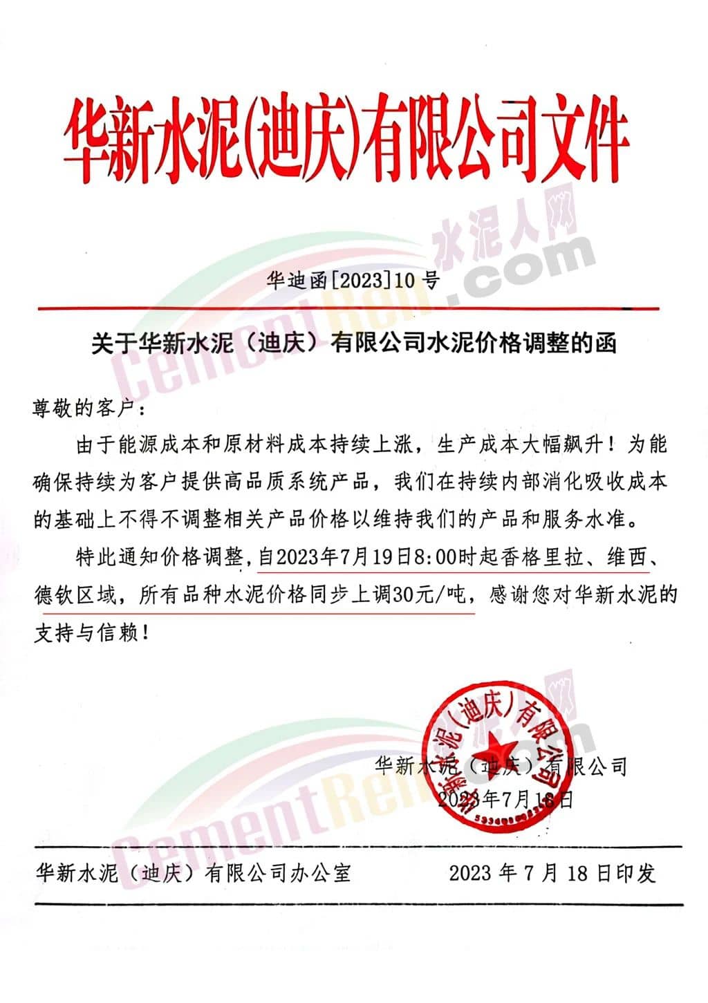 華新水泥(迪慶)有限公司通知,由于能源成本和原材料成本持續(xù)上漲,生產(chǎn)成本大幅飆升,為能確保持續(xù)為客戶提供高品質(zhì)系統(tǒng)產(chǎn)品,企業(yè)在持續(xù)內(nèi)部消化吸收成本的基礎(chǔ)上不得不調(diào)整相關(guān)產(chǎn)品價(jià)格以維持產(chǎn)品和服務(wù)水準(zhǔn)特此通知價(jià)格調(diào)整,自2023年7月19日8時(shí)起香格里拉、維西、德欽區(qū)域,所有品種水泥價(jià)格同步上調(diào)30元/噸。