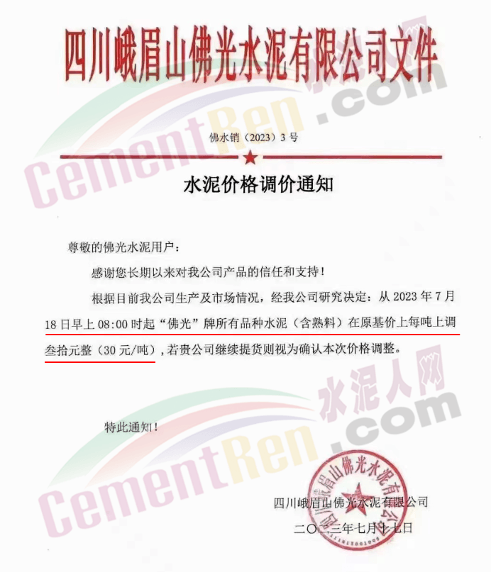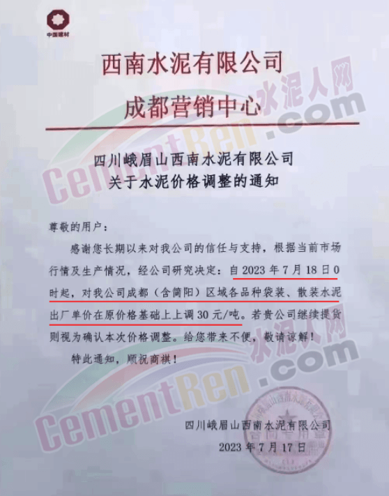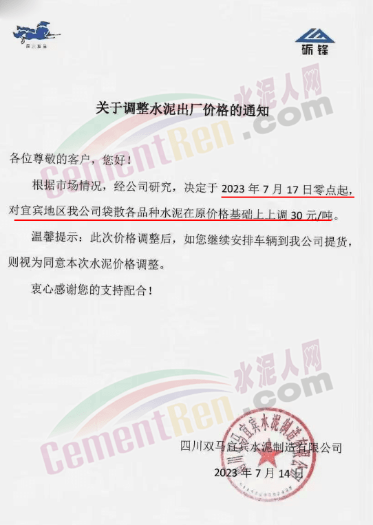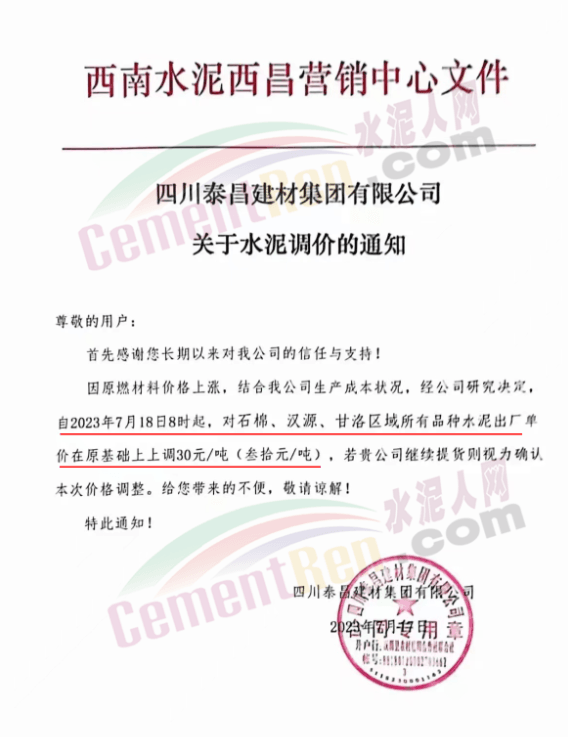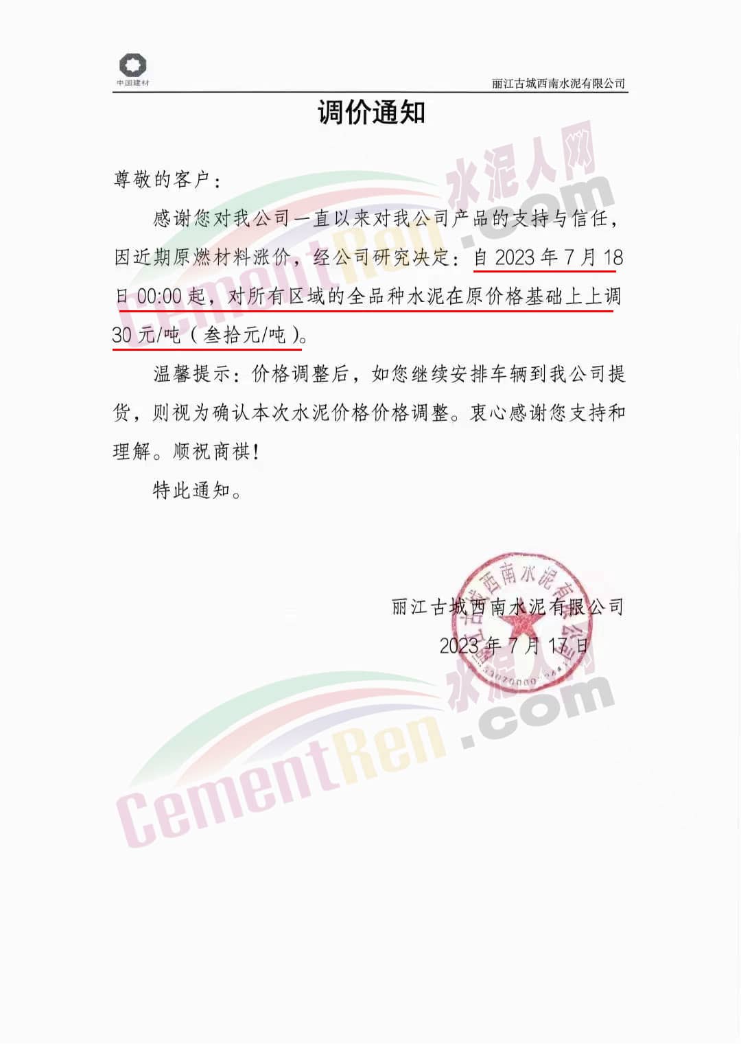 麗江古城西南水泥有限公司通知,因近期原燃材料漲價(jià),經(jīng)公司研究決定,自2023年7月18日0時(shí)起,對(duì)所有區(qū)域的全品種水泥在原價(jià)格基礎(chǔ)上上調(diào)30元/噸。