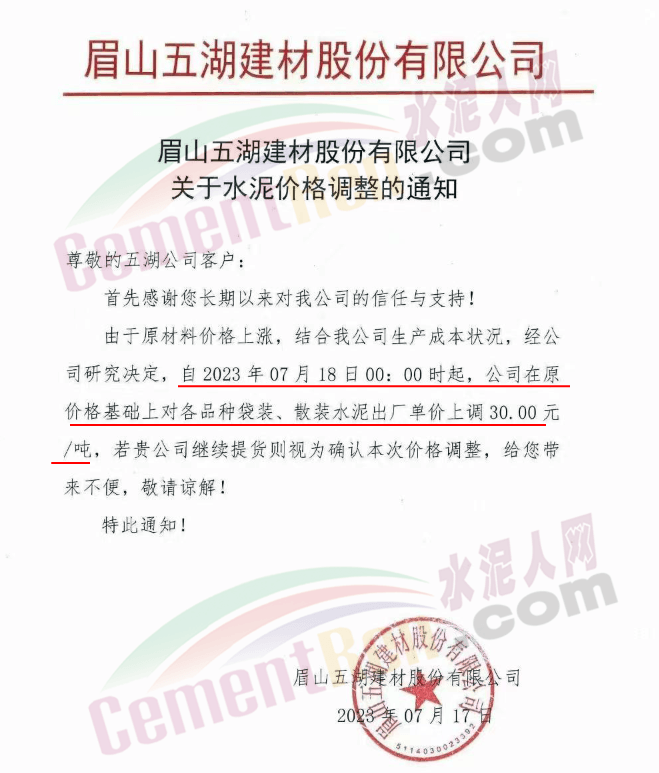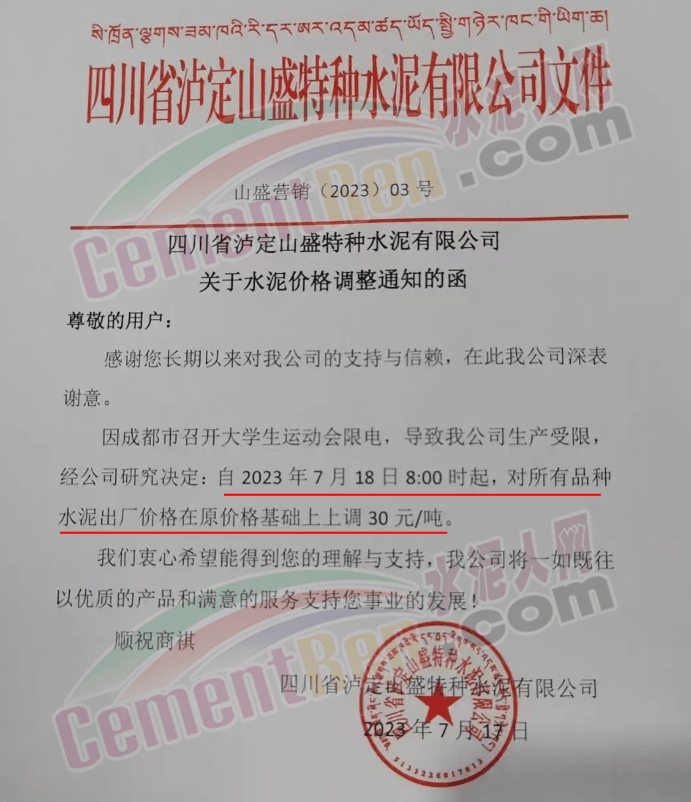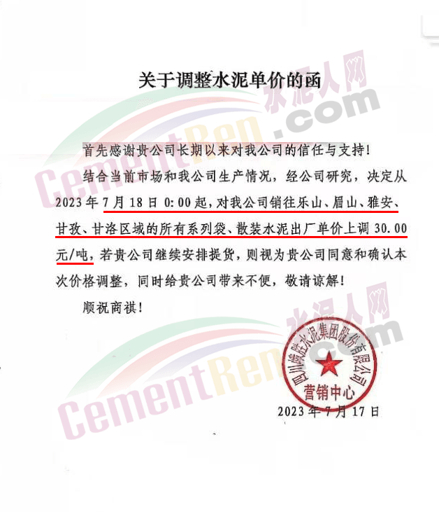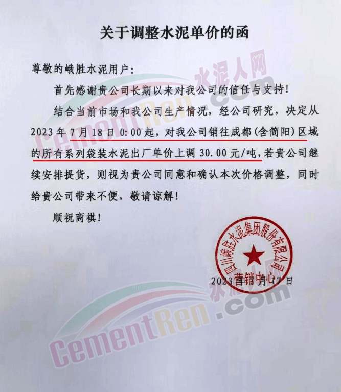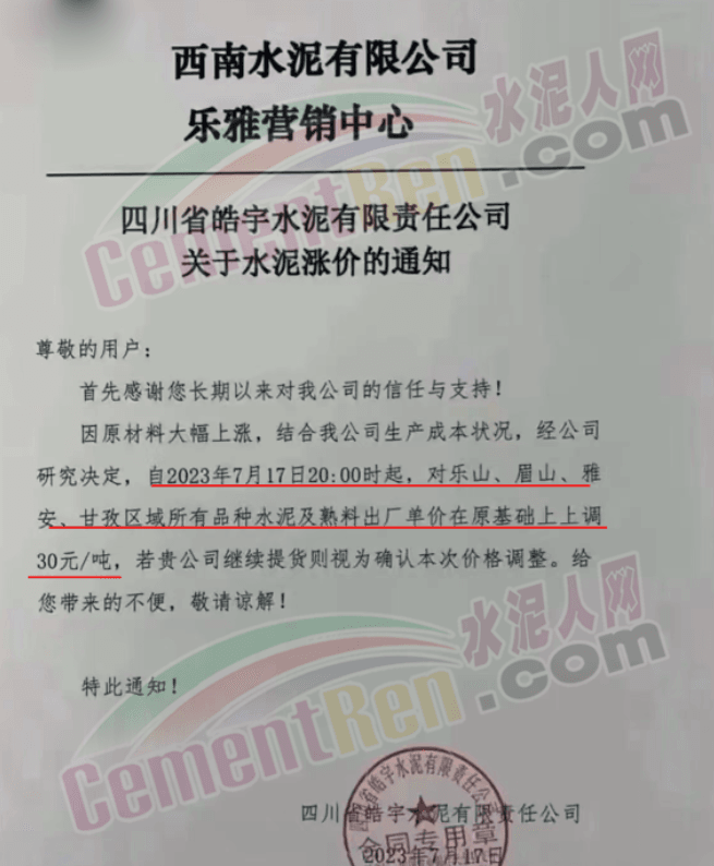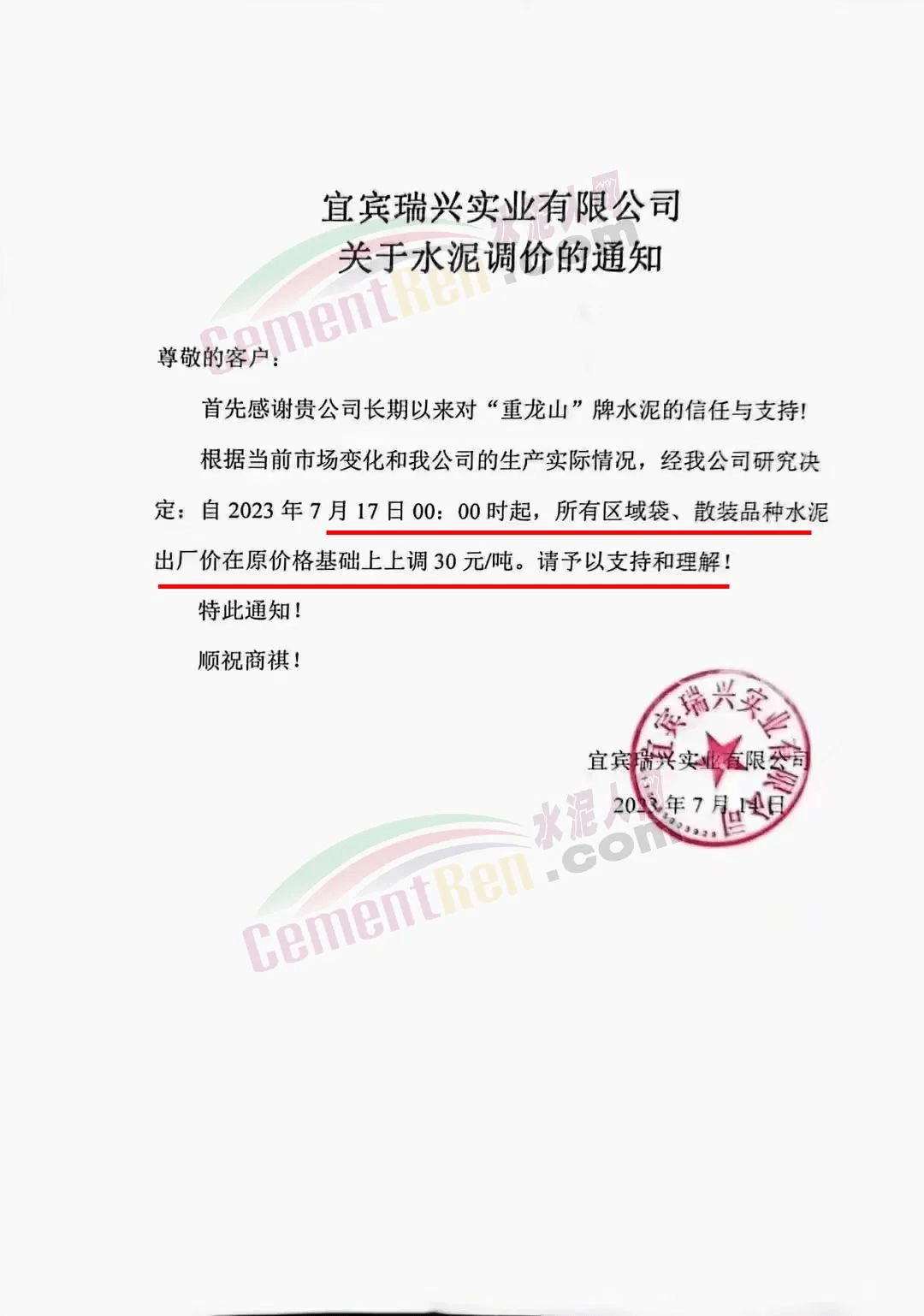 麗江古城西南水泥有限公司通知,因近期原燃材料漲價(jià),經(jīng)公司研究決定,自2023年7月18日0時(shí)起,對(duì)所有區(qū)域的全品種水泥在原價(jià)格基礎(chǔ)上上調(diào)30元/噸。